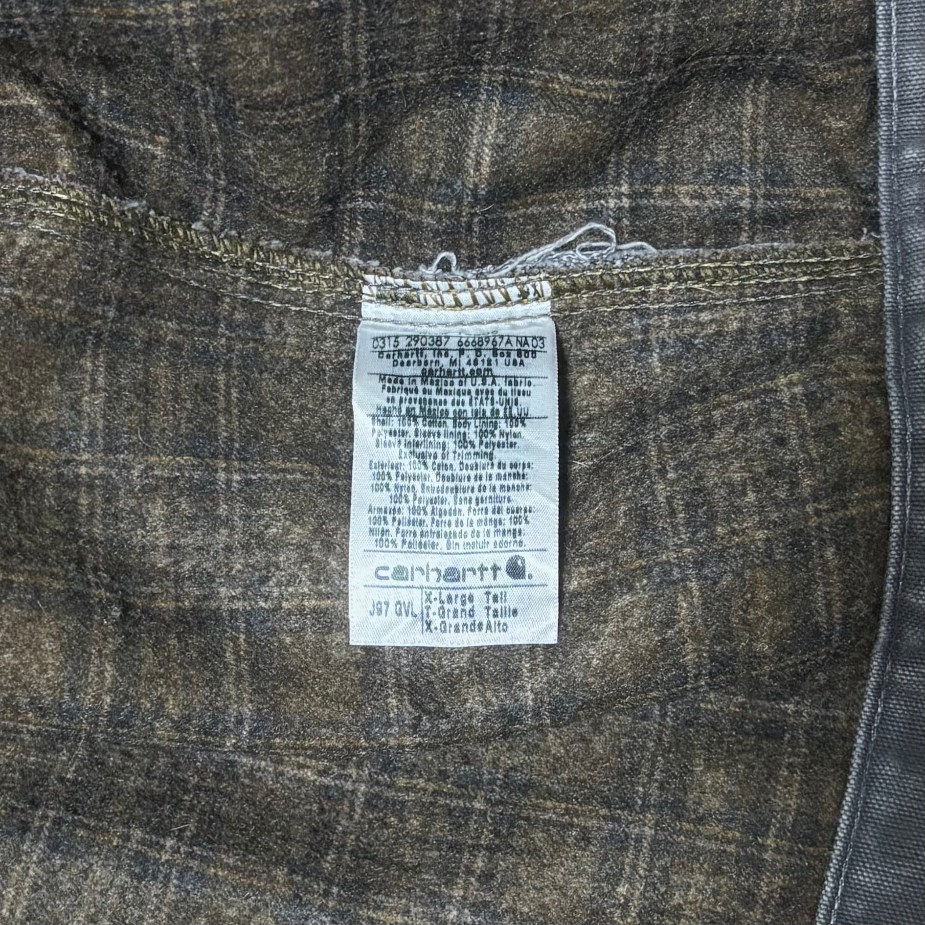 こちらは2015年3月製・メキシコ製のCarhartt、廃盤モデルJ97(GVL)です。海外ではジョニー・デップをはじめとする著名人の着用でも知られ、日本では野村訓市氏などの影響もあり、近年注目度が高まっているモデルになります。現在、相場も上昇傾向にあり、古着市場でも非常に人気の高い廃盤モデルです。