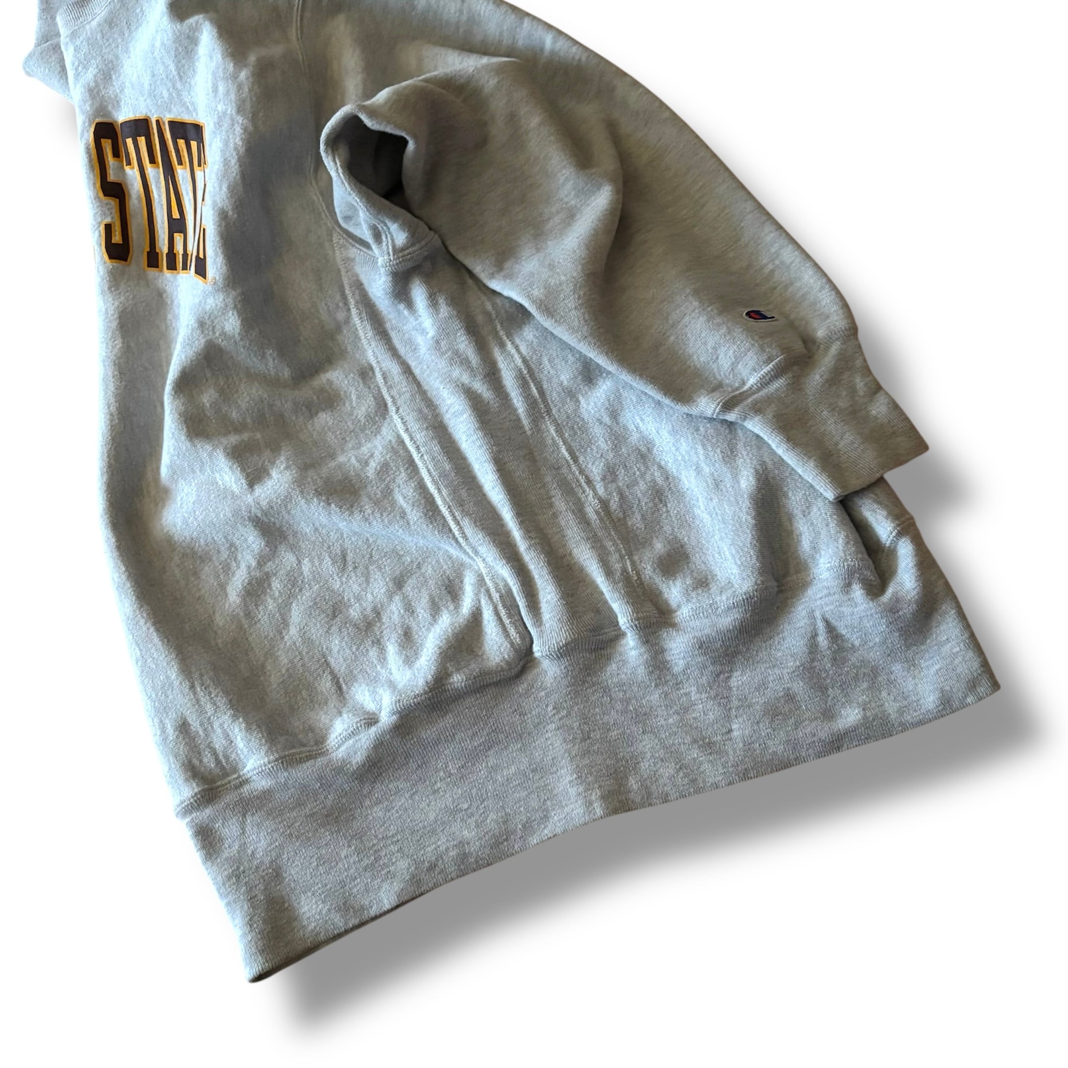 90年代USA製の貴重なChampion リバースウィーブ。アメカジの定番として根強い人気を誇る一着です。「袖目あり」の無地グレーボディに、胸元と袖にはFLORIDA STATEのイエローロゴが施されており、存在感のあるデザイン。サイズは需要の高いゴールデンサイズのXLです。