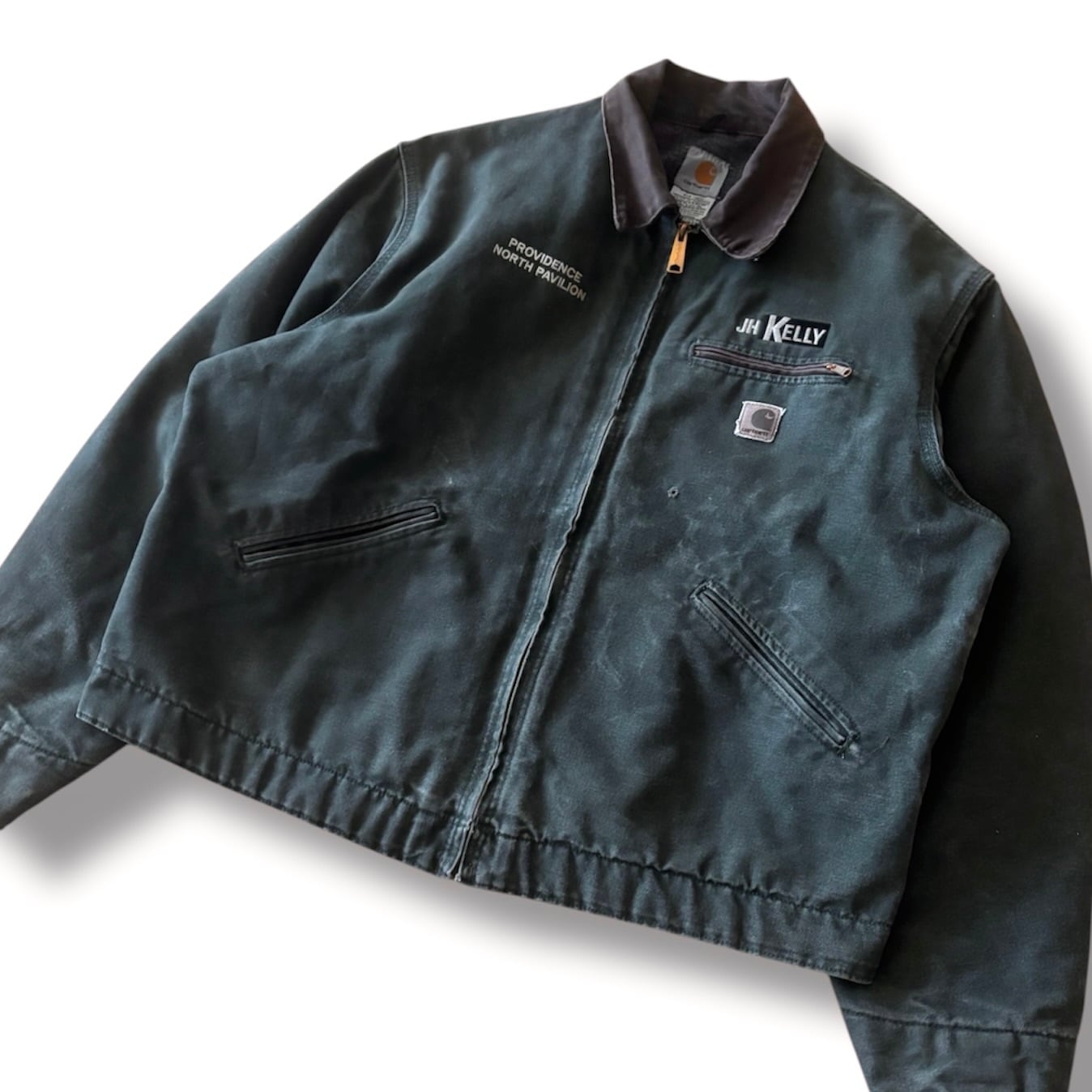 こちらは2006年12月製・USA製のVintage Carhartt デトロイトジャケット。すでに廃盤となっている希少カラーで、市場需要の高いXLサイズ。今っぽく短丈・ジャストサイズで着たい方にも特におすすめです。カラーは最も人気の高いMOS(モスグリーン)。近年は海外市場でも特に注目度が高まっているカラーです。さらに胸元には企業刺繍入りという、近年特に人気の高い好条件の組み合わせとなっております。