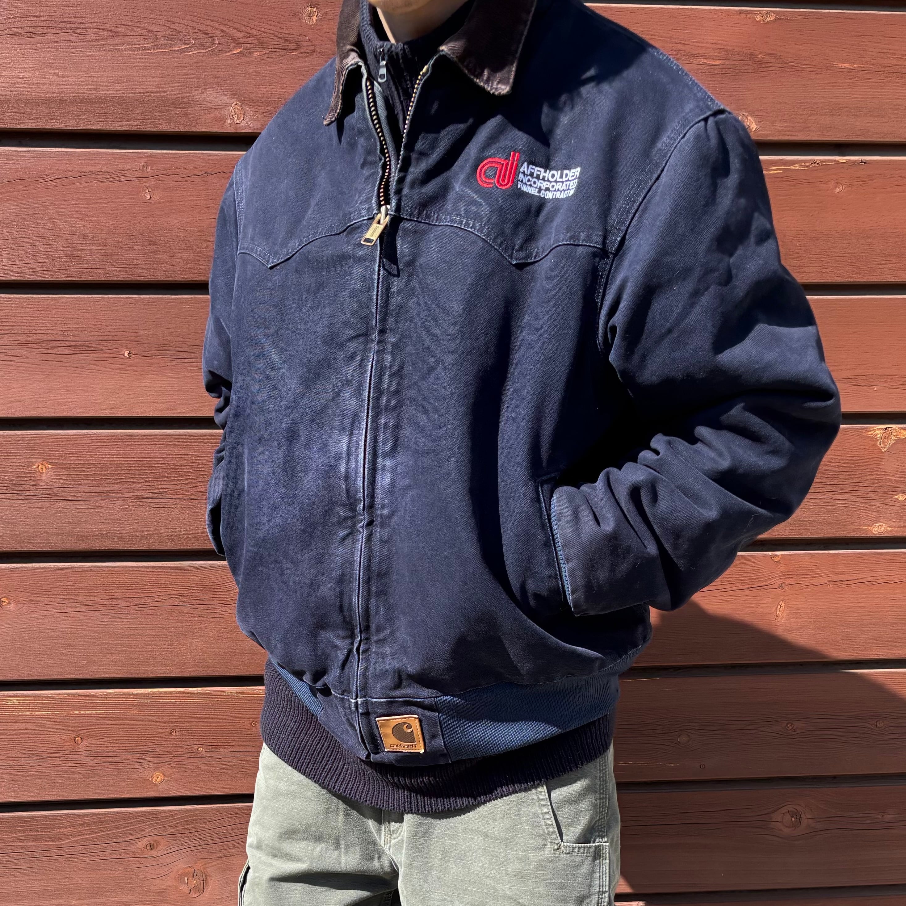 野村訓市氏が着用したことで世界的に人気が爆発し、現在も価格が高騰し続けている超希少カラー「MDT」である点が最大の魅力です。こちらは2009年3月製、USA製のVintage Carhartt。市場でも需要の高いLサイズに、異色のブラウンコーデュロイ襟、さらに胸元には企業刺繍入りという、近年特に人気の高い好条件が揃った一着です。