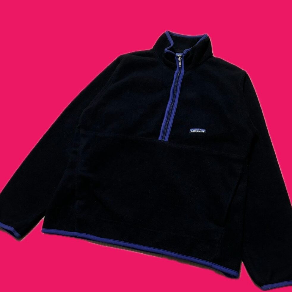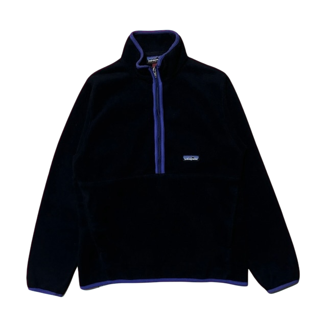 Patagoniaの名作「マースピアル」。現行モデルとは異なるデザインで、渋さとカッコよさが際立つ一着です。ハーフジップ仕様のプルオーバーで、シンチラフリースならではの柔らかい質感と程よいボリューム感が魅力。フロントポケットも嬉しいポイントの一つです。本体はブラックで、パープルのトリミングが施されています。